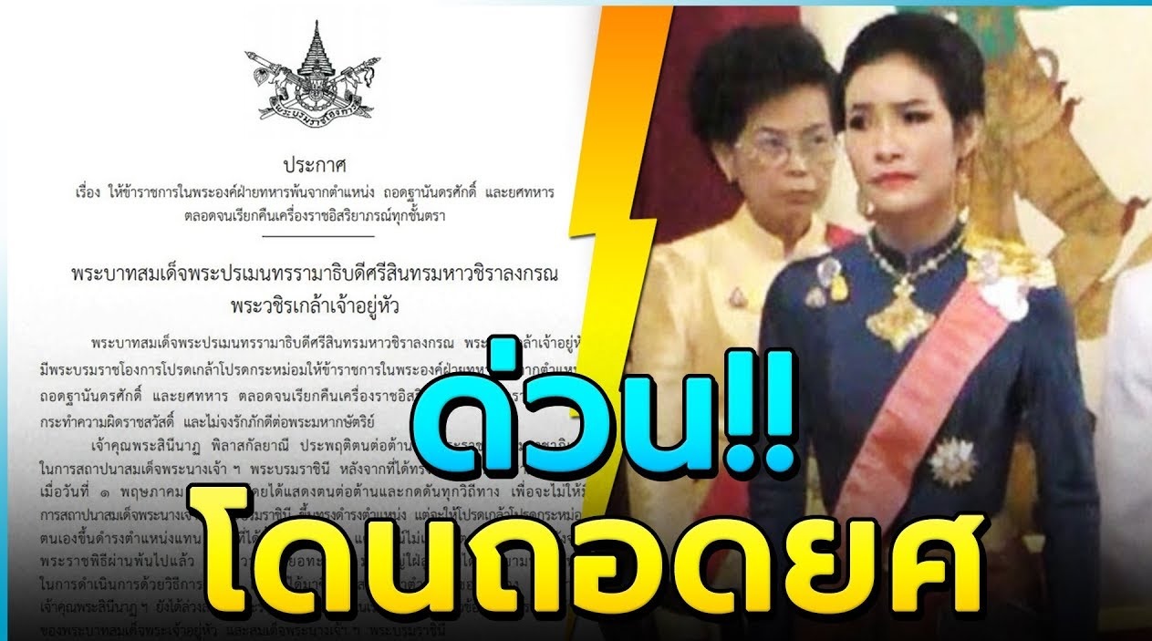 วันที่ 21 ต.ค. ราชกิจจานุเบกษา เผยแพร่ พระบรมราชโองการ ประกาศ เรื่องให้ข้าราชการในพระองค์ฝ่ายทหารพ้นจากตำแหน่ง ถอดฐานันดรศักดิ์ และยศทหาร ตลอดจนเรียกคืนเครื่องราชอิสริยาภรณ์ทุกชั้นตรา ความว่า